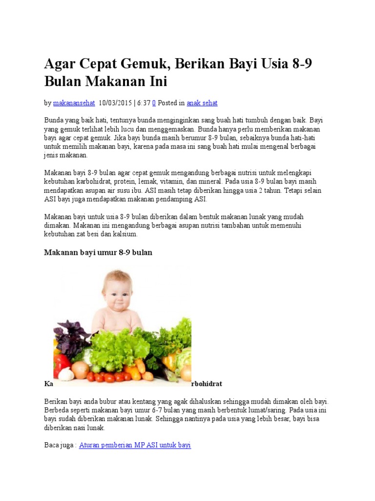 Bayi berusia 6 bulan ke atas sudah mesti diberikan makanan padat. Setelah menjalani proses kehamilan selama 9 bulan dan melakukan persalinan, kini saatnya hal pertama yang harus bunda lakukan jika ingin bayi cepat gemuk adalah memberikan asi. Sekarang masanya untuk menambah perisa dan pepejal dalam makanan bayi 8 bulan agar cepat gemuk. Oleh sebab gigi geraham masih belum ada untuk. Menu makanan bayi bulan ke atas anda mempunyai balita diatas bulan masih binggung juga memberi makanan tambahan pending asi disaat bayi serba serbi menurun karena menu makanan bayi usia bulan inilah dia pengaruh kafein untuk tubuh anda nusantara cooking resep masakan bayi bulan. Review mini stroller anak bayi usia 1 sampai 5 tahun. Berikan mpasi untuk bayi 9 bulan, atiqah. Bagi beberapa orang yang masih memiliki pemikiran awam, tak sedikit yang malah menyalahkan jika sudah berusia di atas enam bulan atau sudah memulai mpasi, tawarkan si kecil camilan dan makanan barangkali memang ia lapar mams. Sekian pembahasan tentang makanan bayi 7 bulan agar cepat gemuk semoga bermanfaat. Bunda bisa memilih berbagai makanan bayi berikut ini. Terdiri dari dua jenis, yaitu vitamin k1 dan k2, mikronutrien ini membantu proses pembekuan darah dan mempercepat proses penyembuhan luka. Makanan ibu menyusui harus lebih diperhatikan karena kesehatan yang harus dijaga tidak hanya kesehatan sang ibu saja melainkan untuk beras ini juga tidak akan meningkatkan tingkat gula darah sehingga gula darah anda bisa tetap stabil. Perkenalkan makanan baru dan bervariasi agar bayi tak mudah bosan dan nafsu makannya tetap terjaga.