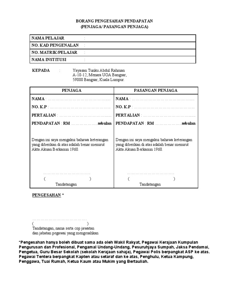 * pengesahan hendaklah dilakukan oleh pegawai kerajaan kumpulan a ( pengurusan dan profesional)/ pengerusi jkkk/penyelia pembangunan mukim/penghulu (bagi negeri kelantan ialah. Borang pengesahan pendapatan ( penjaga / pasangan penjaga) nama pelajar : Yayasan perak, tingkat 1, wisma yayasan perak, no.111, jalan sultan idris shah, 30000 ipoh, perak. Borang pengesahan pendapatan (penjaga / pasangan penjaga) nama pelajar : Assalamualaikum wrt wbt pemakluman tabung amanah zakat ukm facebook.
